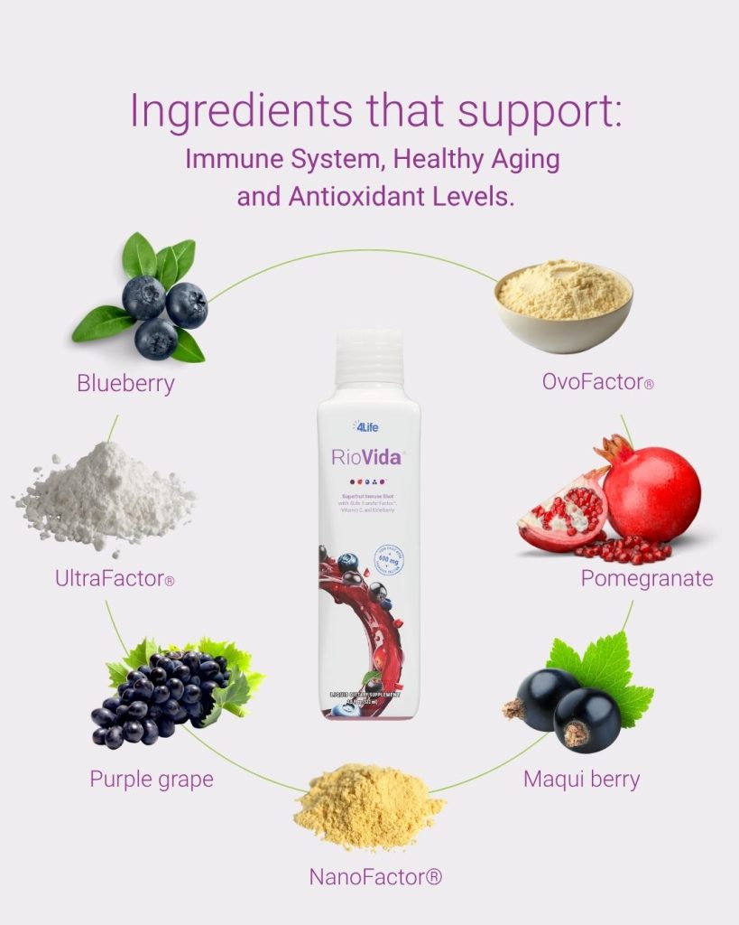 4Life Transfer Factor® RioVida® Tri-Factor® Formula es el único suplemento dietético líquido en el mundo que combina los beneficios de 4Life Transfer Factor con súper frutas ricas en antioxidantes, como el açaí, la granada, el arándano azul, la baya del sauco y la uva. Esta potente concentración de ingredientes activos provee educación que respalda la capacidad del cuerpo para mantener la salud y la energía diarias.*